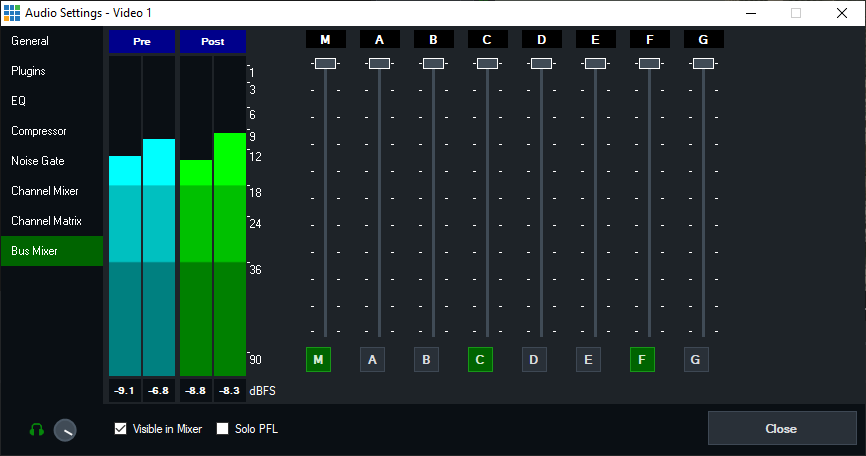 where each of the independent NDI or SDI Embedded audio channels can be routed to one of the eight stereo audio buses.